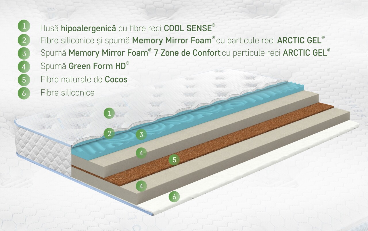 Concepută pentru cei care caută echilibrul perfect între susținere fermă și confort adaptiv. Aceasta îmbină tehnologia avansată a spumei Green Form HD®, recunoscută pentru proprietățile sale ortopedice, cu efectul relaxant al spumei Memory Mirror Form®, îmbogățită cu particule reci Arctic Gel, pentru un climat de somn plăcut și o adaptare precisă la forma corpului. Stratul de cocos natural adaugă fermitate și stabilitate, iar husa textilă de calitate superioară asigură o ventilație eficientă și o atingere plăcută, contribuind la un somn sănătos și odihnitor, noapte de noapte.