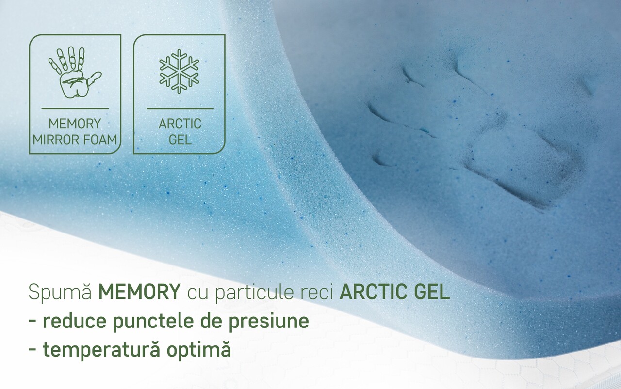 Stratul de confort din spumă Memory Mirror Form® cu particule Arctic Gel® este special conceput pentru a reacționa la temperatura corpului, adaptându-se perfect conturului acestuia. Această tehnologie avansată elimină punctele de presiune, relaxează musculatura și susține o circulație sanguină optimă pe durata somnului. Particulele de Arctic Gel contribuie la menținerea unei temperaturi constante și răcoroase, sporind astfel confortul termic. Pe cealaltă față, salteaua oferă o senzație mai fermă, fiind matlasată cu un strat generos de fibre siliconice pentru un mediu de somn sigur, igienic și plăcut la atingere.