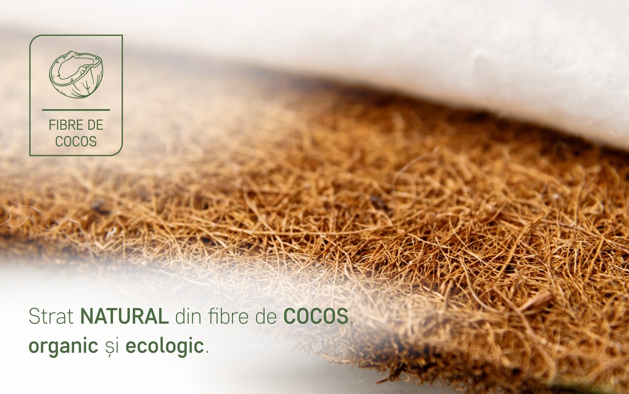 Placa din fibră de nucă de cocos adaugă saltelei un strat natural de susținere, ideal pentru menținerea unei poziții corecte a coloanei vertebrale. Obținută prin presarea fibrelor de cocos atent selecționate și îmbibarea acestora cu latex natural încălzit, această combinație rezultă într-un material durabil, elastic și extrem de rezistent în timp. Structura sa aerată permite o circulație optimă a aerului în interiorul saltelei, prevenind acumularea umezelii și oferind un mediu de somn igienic și bine ventilat.