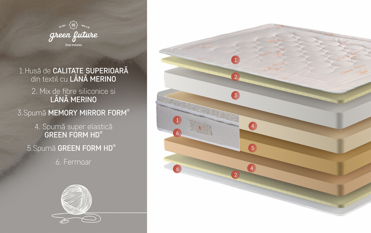 - Pentru a prelungi durata de viața a saltelei, vă recomandăm achiziționarea protecției speciale GREEN-FUTURE. Protecția specială poate fi ușor întreținută, permițând spălarea în mașina de spălat sau manual cu apă rece.