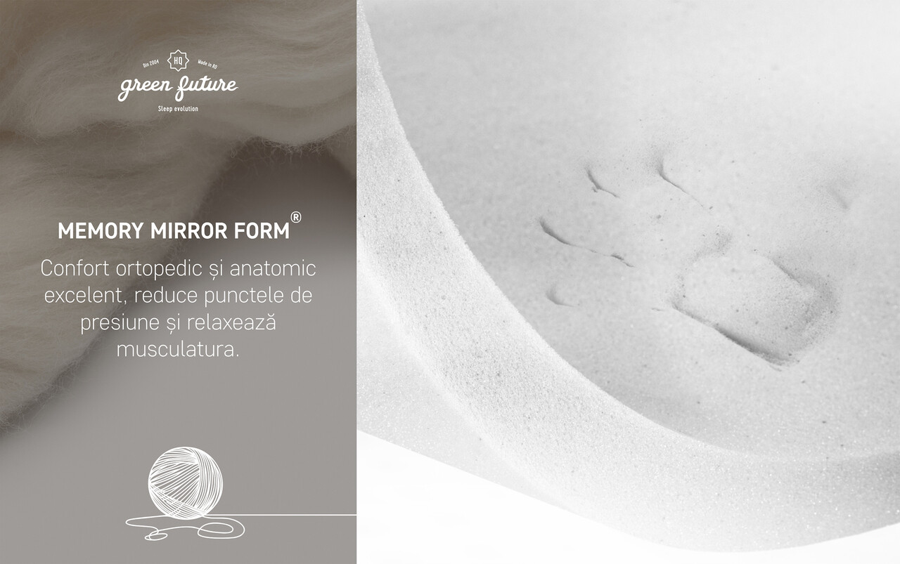 Stratul de 7 cm spumă Memory Mirror Form® reacționează la căldura corpului, adaptându-se perfect la forma acestuia și eliminând punctele de presiune. Astfel, se favorizează relaxarea mușchilor și o circulație sanguină optimă pe parcursul nopții.