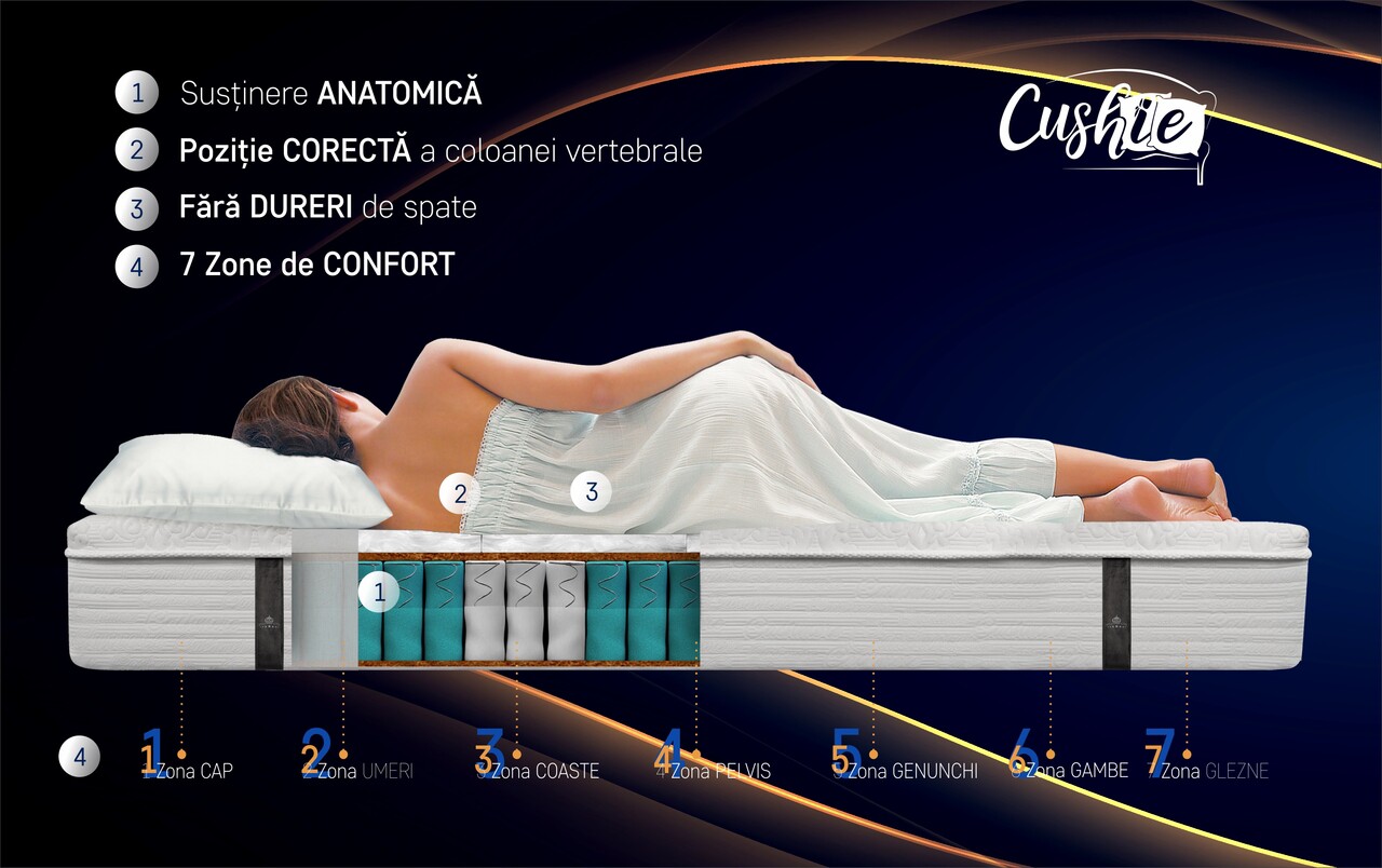 Baza saltelei, care garantează o poziție ortopedică corectă pe parcursul somnului, este realizată din arcuri Pocket individual ambalate, un sistem preferat de profesioniștii din domeniul hotelier, ce oferă un confort de neegalat în timpul somnului, eliminând durerile de spate.