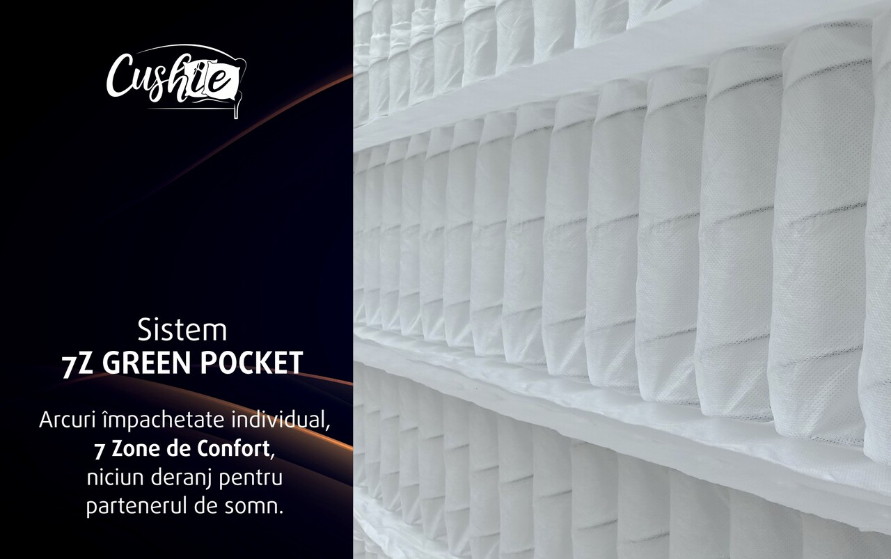 Fiecare arc este ambalat separat în casete din material textil și reacționează independent la presiunea exercitată, astfel încât se conturează perfect pe forma corpului. Datorită absenței legăturilor între arcuri, acestea nu influențează mișcările celorlalte, garantând o stabilitate excelentă și fără perturbări pentru partenerul de somn. De asemenea, sistemul 7Z Green Pocket® oferă un suport adaptat pentru fiecare zonă a corpului, în funcție de presiunea aplicată pe saltea, asigurând o aliniere corectă și sănătoasă a coloanei vertebrale.